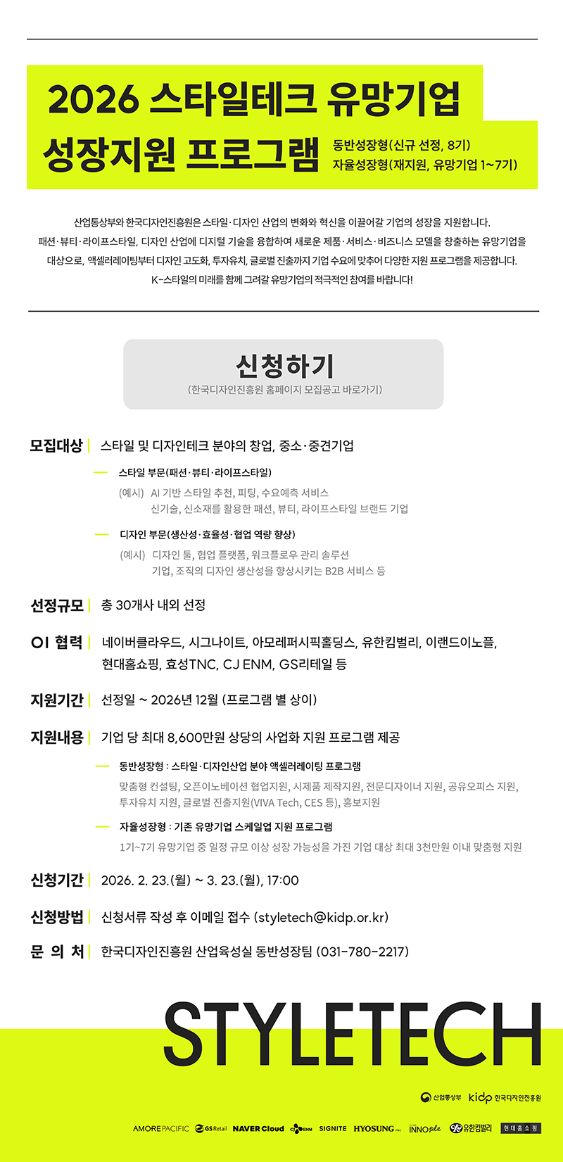 패션·뷰티·라이프스타일, 디자인 산업에 디지털 기술을 융합하여 새로운 제품·서비스·비즈니스 모델을 창출하는 유망기업을 대상으로, 액셀러레이팅부터 디자인 고도화, 투자유치, 글로벌 진출까지 기업 수요에 맞추어 다양한 지원 프로그램을 제공하는 사업입니다.