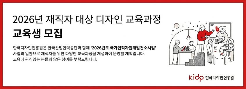 실무 디자인 인력에 필요한 교육 프로그램 매년 산업계 수요 조사를 통해 실무 디자인 인력에 필요한 신기술 및 취약 분야 교육 프로그램을 개발·확산하며, 국내 중소기업 실무 디자이너 역량 향상을 위한 교육 프로그램을 제공합니다.