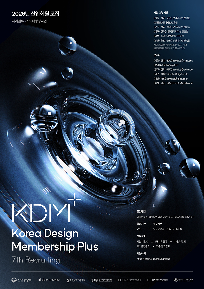 전국의 잠재력 있는 학생(학사학위 2학년 이상)을 선발하여 2년간 다양한 실무형 디자인 교육을 통해 산업현장에 바로 투입 할 수 있는 세계일류 수준의 실무 디자이너로 육성하는 디자인 멤버십 프로그램입니다.