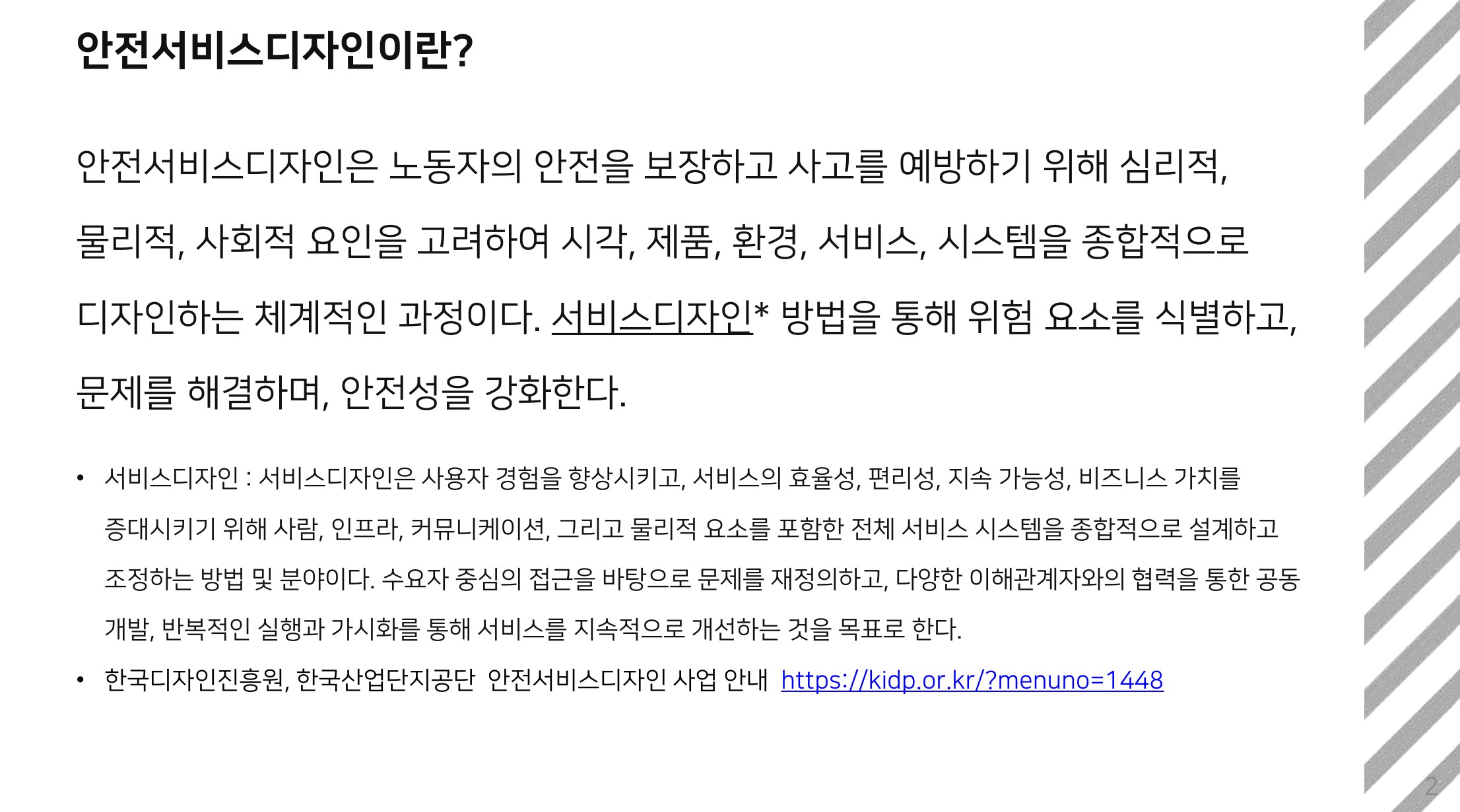 이 자료는 한국디자인진흥원 서비스디자인실에서 그간 개발한 다양한 작업장 안전디자인 사례 중 일부를 정리한 것이다. 작업장 안전을 개선을 위해 디자인을 어떻게 활용할 수 있는지 보여준다.