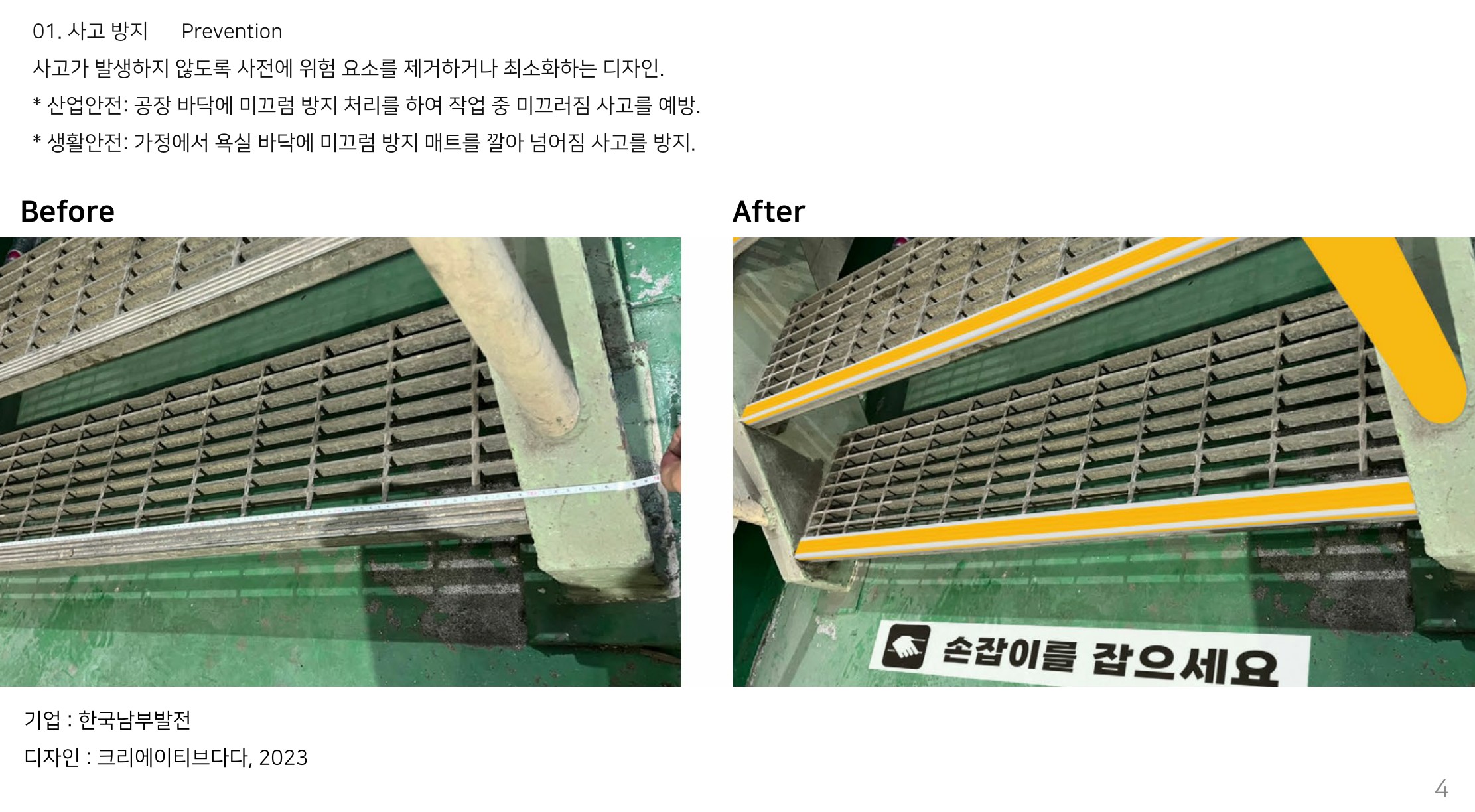 주요 사례로는 한국남부발전과의 협업을 통해 미끄럼 방지 바닥 처리로 사고를 예방하거나, 인천남동공단 피엘코스매틱의 리프트 안전가드를 설치해 낙하 사고를 방지하는 등의 산업 안전 개선 사례들이 포함되어 있다. 또한, 위험 구역의 시인성 강화, 비상구의 시인성 개선 등 사용자에게 명확한 경고와 안내를 제공해 사고를 예방하는 사례도 있다​.